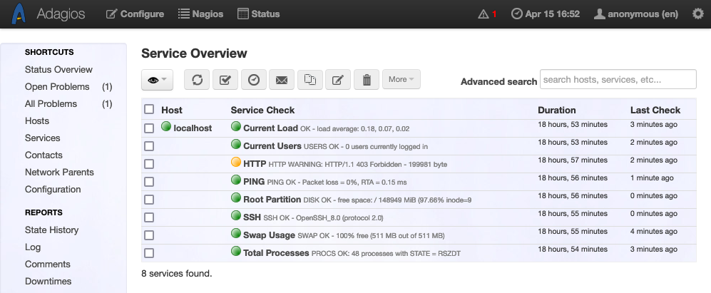 From here, use Adagios to navigate the myriad information about your monitored hosts and services. More details are available through the options on the left menu, such as navigating to the Services page to see a list of monitored services: